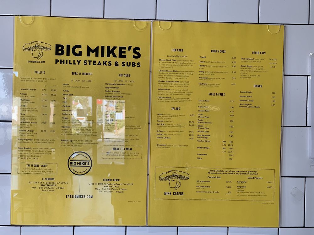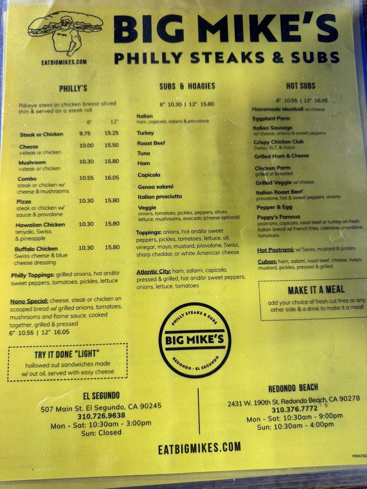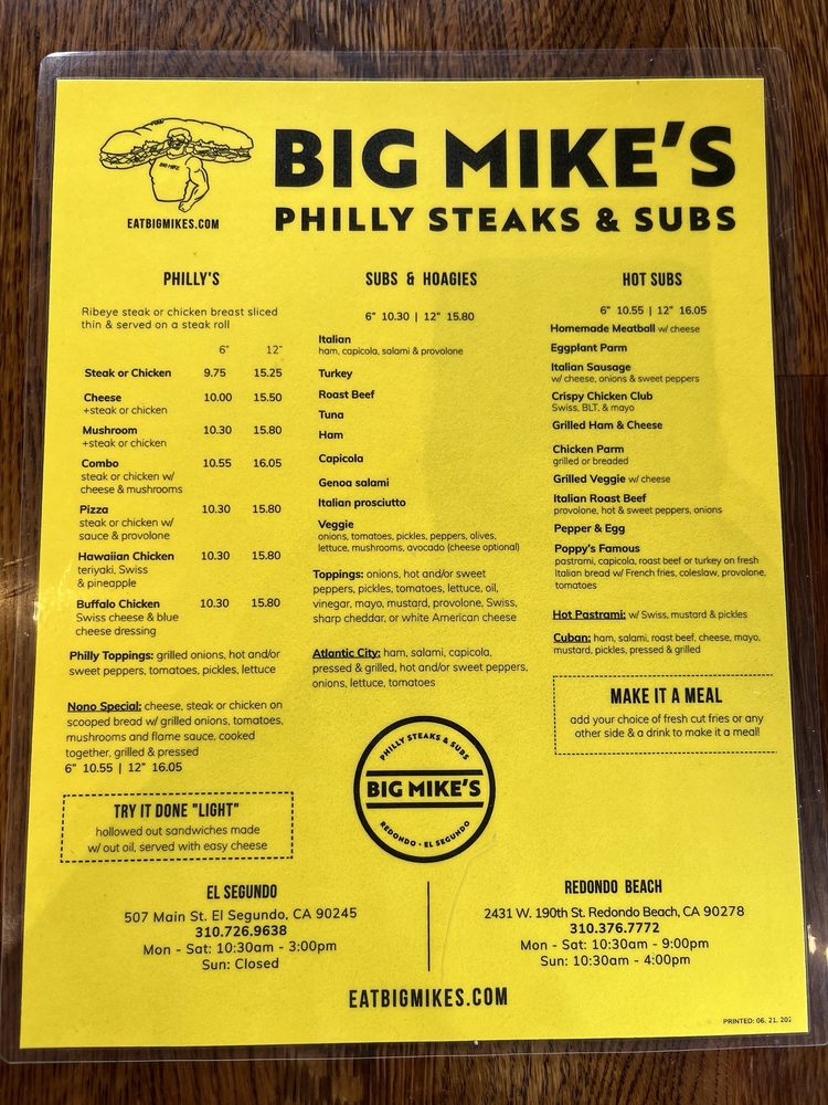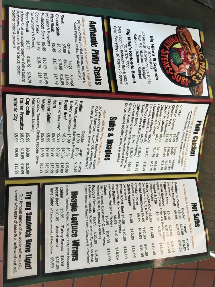 Introducing the menu at Big Mike’s - El Segundo, a casual dining spot in El Segundo, CA, known for its generous portions and friendly staff. Offering a variety of sandwich options, from classic favorites to inventive creations, all made with fresh and high-quality ingredients. Highlights include the six-inch steak and cheese loaded with grilled onions and sweet peppers, and the hot veggie sub bursting with flavor. Customers rave about the soft sub rolls and the perfect balance of flavors in each bite. While some reviewers mention a need for more flavor in certain dishes, overall, Big Mike’s offers a satisfying dining experience for those looking for a hearty meal in a relaxed setting. With options for delivery, takeout, and catering, Big Mike’s is a great choice for groups, families, and solo diners alike.